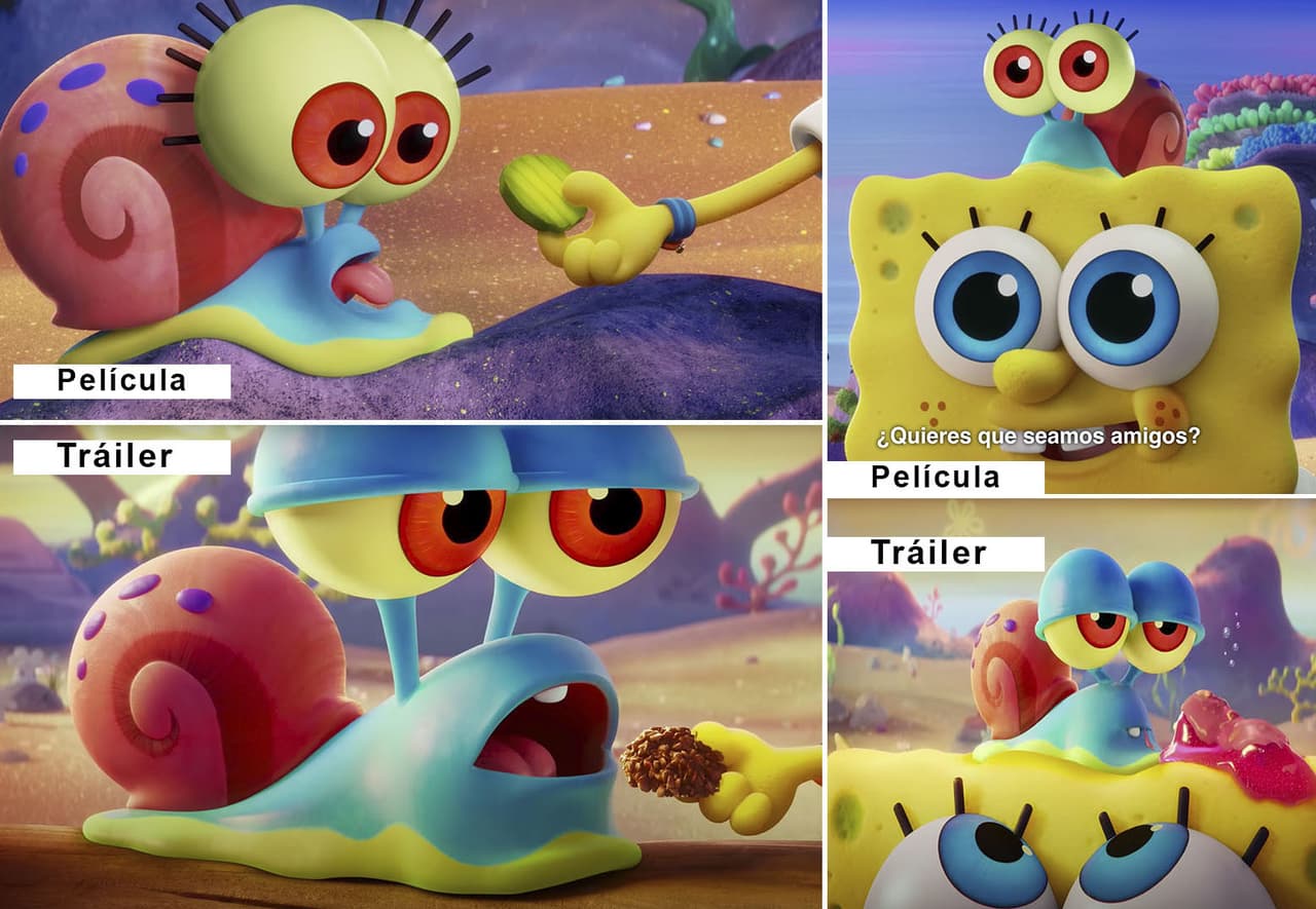 En el tráiler podemos ver a Bob preguntándole a Arenita, Don Cangrejo y Calamardo si han visto a Gary, eso no se ve en la película. Además, en el avance se mostraba la escena en la que Bob y Gary se conocen y es un poquito diferente a cómo se ve en el filme. En el tráiler el pequeño Bob, en el Kamp Koral, le da un pedacito de cangreburger a Gary cuando lo encuentra, después Gary sube a su cabeza y le vomita baba rosa cuando Bob le pregunta si quiere ser su amigo.