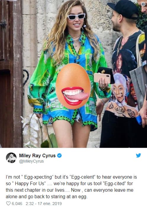 "No estoy esperando nada, pero me parece excelente que todo el mundo se haya alegrado tanto por nosotros. ¡Nosotros también nos alegramos mucho por nosotros! Estamos muy contentos ante este nuevo capítulo de nuestras vidas. Ahora, ¿puede dejarnos en paz todo el mundo y volver a centrar su atención en un huevo?", dijo Miley Cyrus, haciendo referencia a la imagen viral de un huevo en redes sociales.