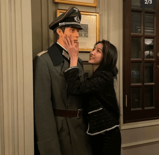 Las imágenes muestran a la artista en una cafetería de Seúl, Corea del Sur, tomando el rostro del maniquí mientras lo mira a los ojos y sonríe, lo cual le consiguió muchísimas críticas en redes sociales por lo que representa el nacismo.