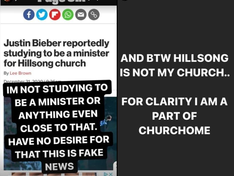 "No estoy estudiando para ser ministro o nada parecido a ello. Esto es una noticia falsa", escribió en su historia de Instagram, sobre la captura de pantalla en donde se ve que Page Six daba dicha noticia.