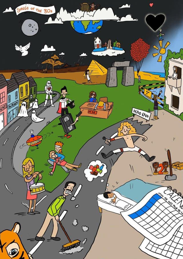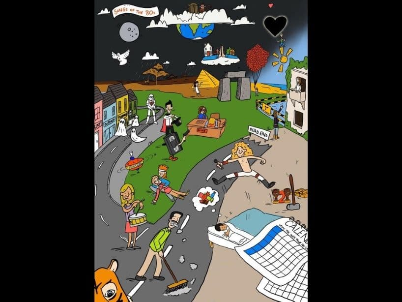 En la siguiente imagen creada por el grupo creativo DoodleMoose Desings se incluyen diferentes referencias de algunos clásicos de aquella época, obsérvala con cuidado y descubre cuáles son las canciones ocultas en la ilustración.