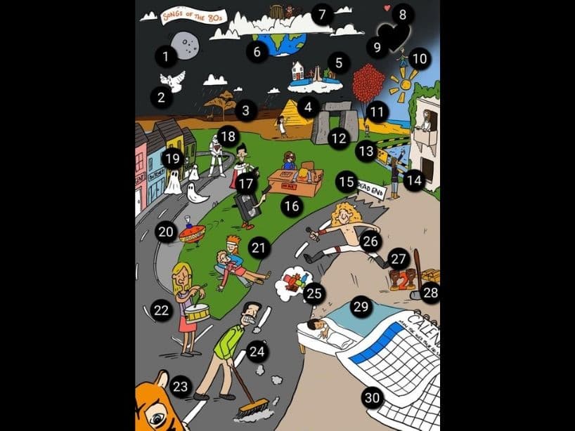 A continuación se numeran las 30 referencias dentro de la imagen y debajo esta el listado de a que canción y artista corresponde cada una de las ilustraciones.