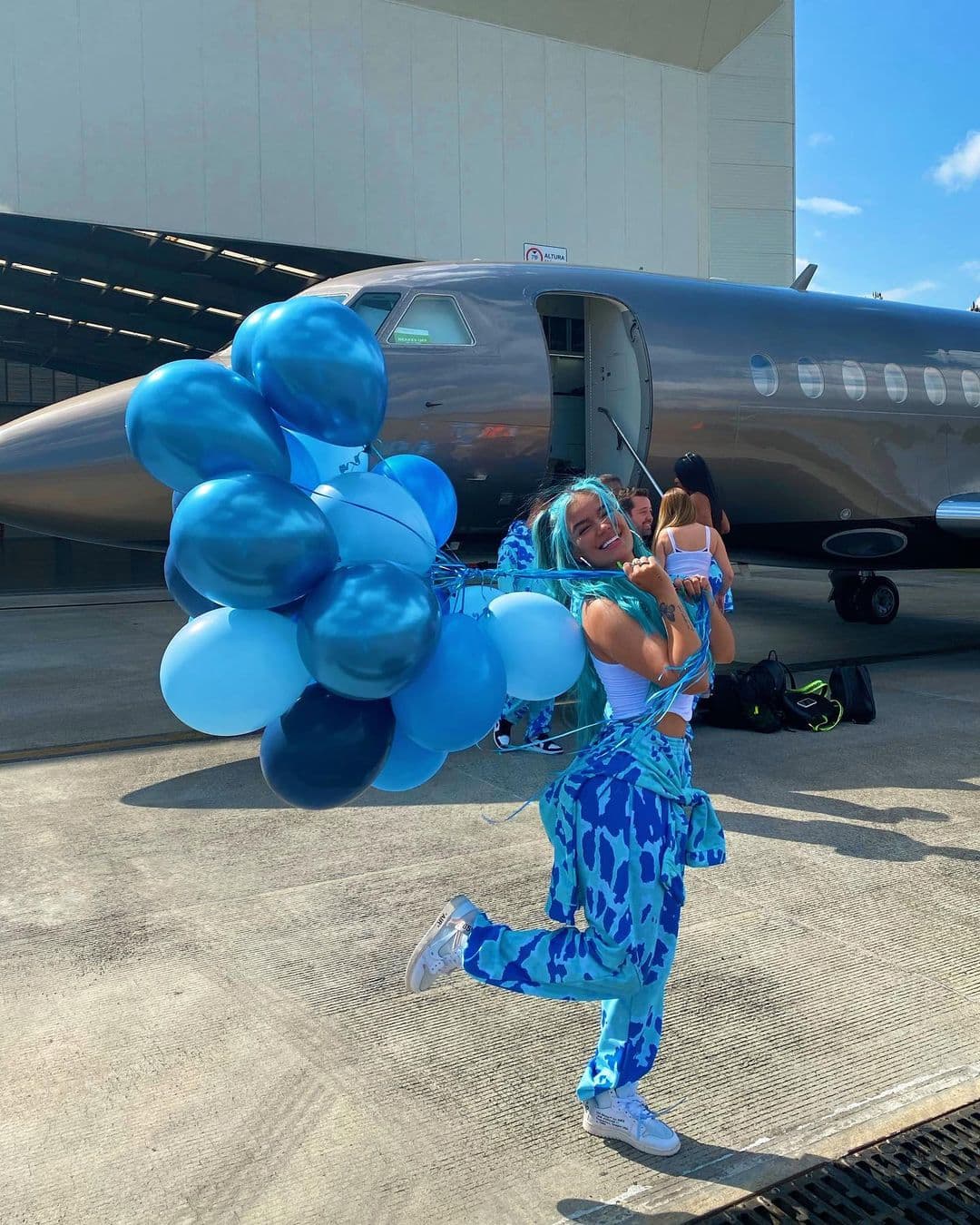 En las imágenes que compartió la vemos sumamente feliz, rodeada de globos y personas que combinan con su vestuario azul. Además también mostró cómo es por dentro su lujoso avión privado.