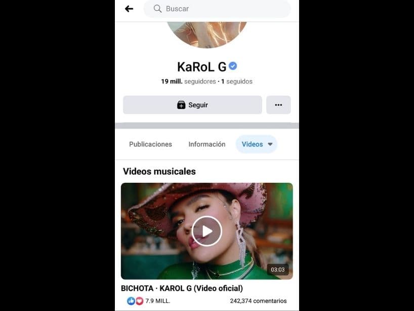 Notarás la sección "Videos Musicales" como en el ejemplo de abajo, donde lo intentamos con Karol G y nos aparece el video oficial de "Bichota" dentro del feed de la colombiana.