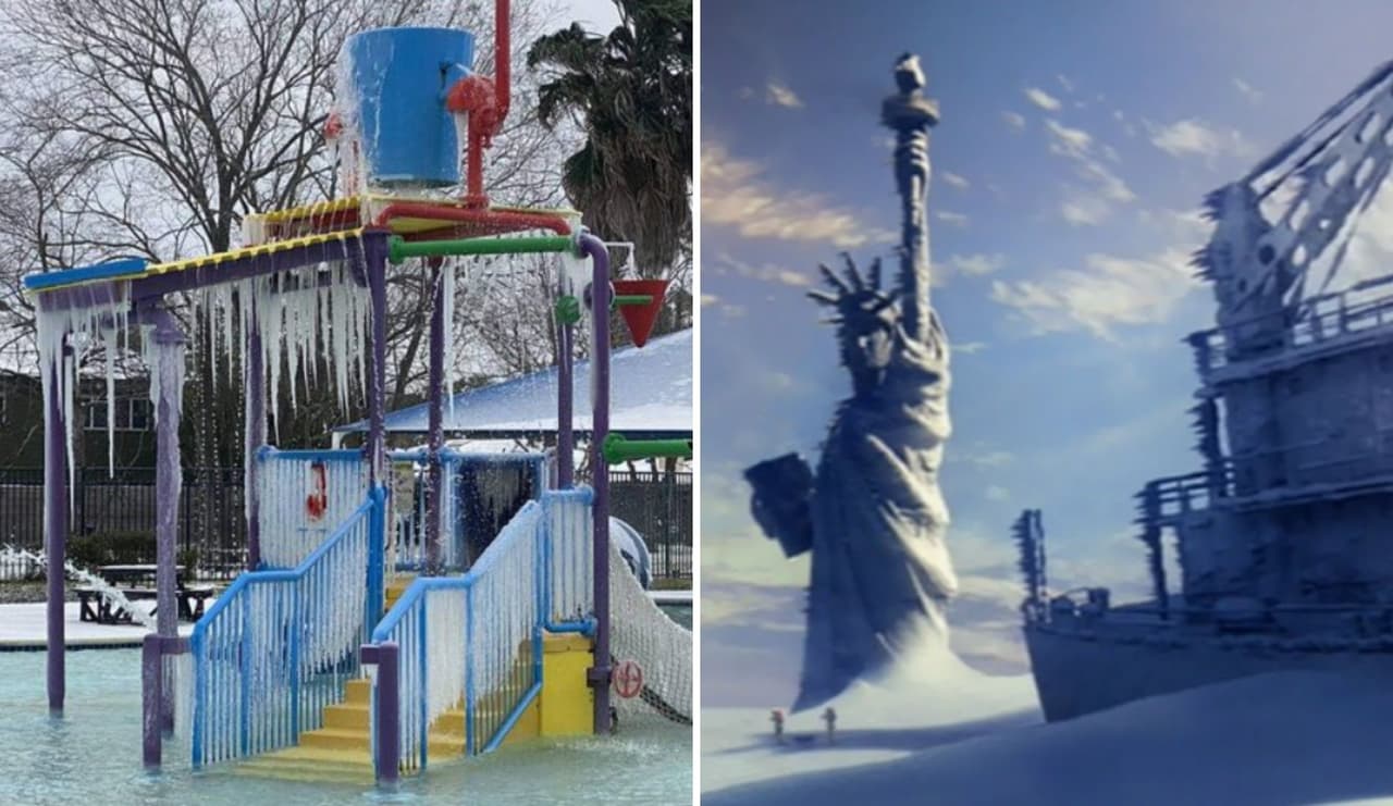 Desde autopistas completamente blancas, albercas congeladas, escusados repletos de hielo o hasta una pecera que cambió el agua por hielo, estas fotografías parecieran extraídas de la película de El Día Después de Mañana del 2004 en la que Jake Gyllenhaal se enfrenta junto a sus seres queridos una helada histórica que elimina prácticamente cualquier posibilidad de vida en Nueva York.