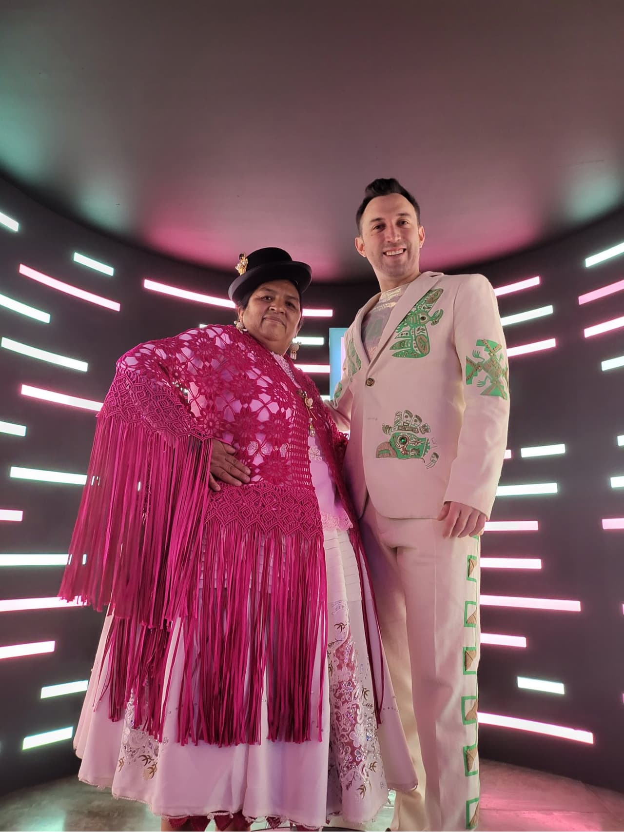 Los representantes de Bolivia llevan, orgullosos de su tierra natal, un par de atuendos cargados de mucho significado. Ella esta usando una parada de lujo, tradicional del país sudamericano; él viste con un traje ecológico con unos tiahuanacotas en verde.
