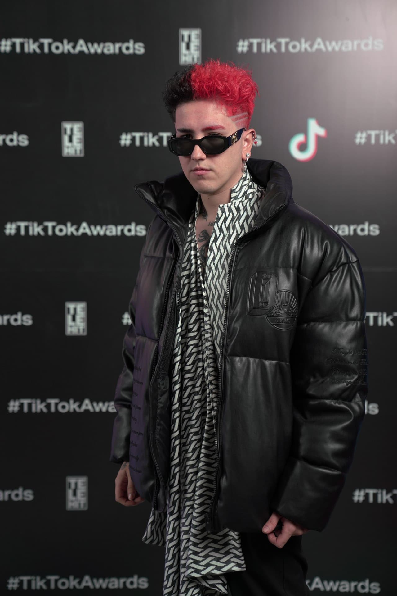 Uno de los tiktokers con más seguidores se presentó con una blusa holgada con un patrón blanco y negro. Omahi, muy fiel a su estilo, agregó una chamarra puffer negra... y aunque los premios fueron en interior, agregó unos lentes oscuros. La cereza del pastel fue su cabello pintado rojo y negro que creó contraste con su look monocromático.