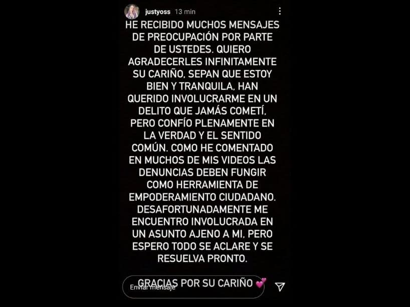 “He recibido muchos mensajes de preocupación por parte de ustedes. Quiero agradecerles infinitamente su cariño. Sepan que estoy bien y tranquila. Han querido involucrarme en un delito que jamás cometí. Pero confío plenamente en la verdad y el sentido común", escribió la influencer.